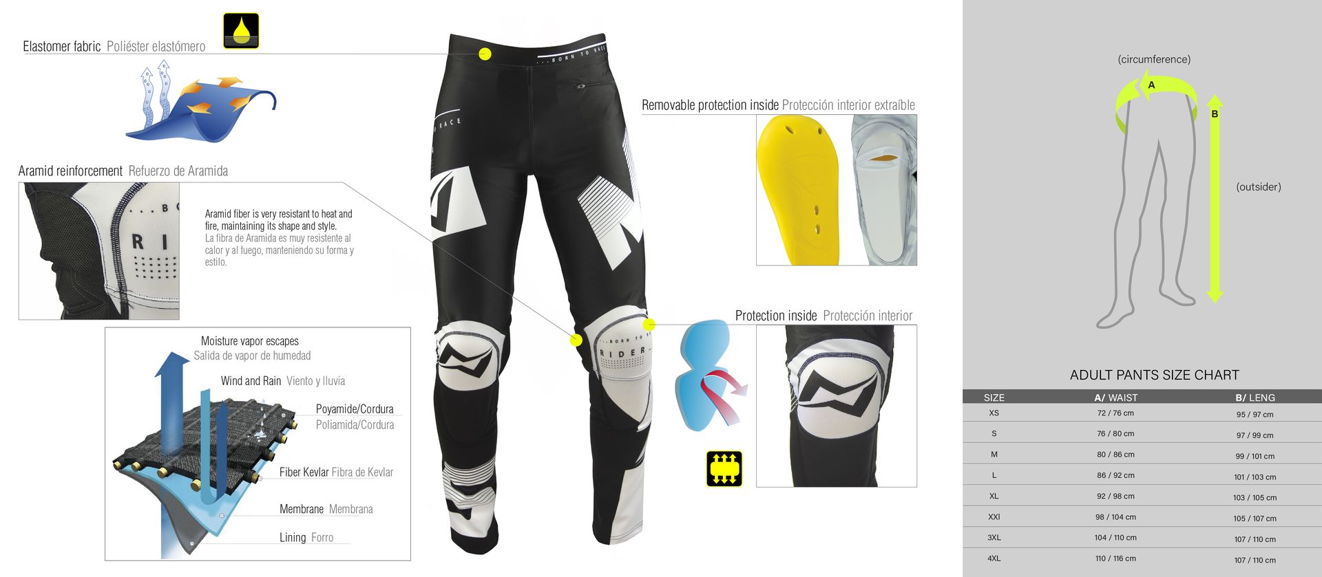 Kevlar elástico con costuras reforzadas en el interior de la rodilla.